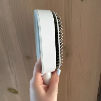 I've been rocking this brush for a few weeks now, and let me you, it's one of the smartest buys I've made in ages. The detangling feature is smooth as butter but still does its job right, even on my thick-as-a-brick, coarse hair. It glides through like a dream without any of that nasty pulling or breaking. Now let's talk about the scalp massage aspect - pure bliss! Every morning feels like a trip the spa with this baby in hand. It works its magic on your scalp making you feel relaxed and ready to start your off right. Talk about self-care! Living where humidity rules supreme can be tough on my hair causing frizz galore. But thanks to this gem and its anti-static material, those frizzy bad hair days are becoming history! This little detail is an absolute game-changer for anyone who knows what it’s like battling with unruly locks daily. But hold up cause there's more! What really makes this product shine brighter than a diamond is the one-key self-cleaning system. Seriously y'all, cleaning has never been easier or more convenient; no more wrestling with hairs tangled around bristles till kingdom come! Just press that button and voila - all clean! So if you're tired of struggling with stubborn knots every morning or just want something that'll give your scalp some love while keeping frizz under control – look no further than this brush here folks because it ticks all those boxes plus some extra ones too!