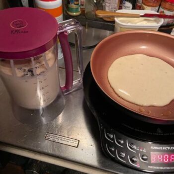 During a visit to my cousins, they were making pancakes for breakfast using a similar pancake dispenser that required squeezing the container to release the batter. Given my small hands, I would have had to use both hands. That's when I decided to search on Amazon and found this one. Although it cost a bit more, the convenience of squeezing the handle to dispense the batter made it worth every penny. It outperforms my old method of using a 1/4 cup and spatula every time!