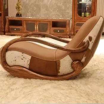 Elegant Ebony Genuine Leather Rocking Chair: Modern Minimalist Luxury Chaise Lounge