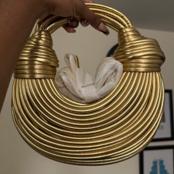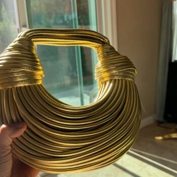I am absolutely enchanted by this bag! It features a stunning golden weave that sparkles subtly under the light, making it a perfect accessory for those who appreciate detailed craftsmanship. The spacious interior is ideal for holding all your necessities, while the durable material ensures it can withstand regular use. It's not just a bag; it's a fashion statement that elevates any outfit, blending functionality with high-end design.