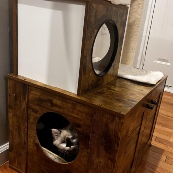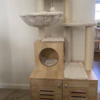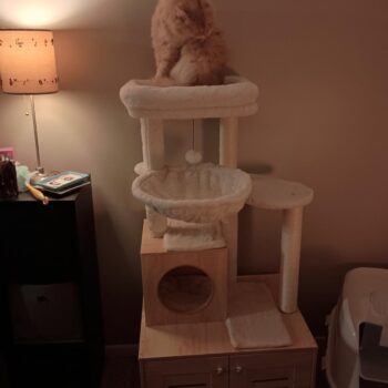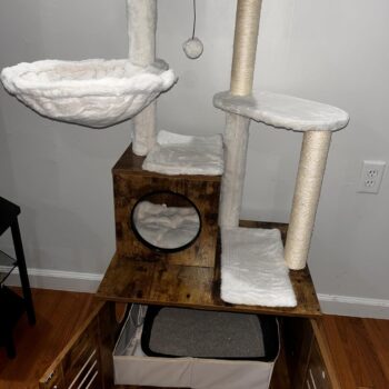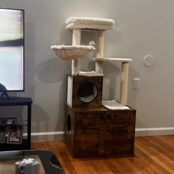 My old buddy, who's a bit on the hefty side, absolutely adores his new cat tree. He’s always snoozing on the very top, so I'm relieved it's solid enough to hold him! Everything came well-marked for a smooth setup. The instructions were a breeze to follow, and it even included all the tools needed, plus a wall anchor for extra security. The bottom compartment is spacious enough for a litter box and comes with a waterproof liner that's removable – super handy for keeping the area clean and odor-free. And, it came with toys! One's a spare for when the first one's had too much love. There are a bunch of scratch posts and a scratch pad that sticks on with double-sided tape. The soft mats also stick on with tape, which I’m a bit iffy about... wondering how that'll hold up after washing off any messes. Putting the cat tree over the litter box is such a smart space saver and keeps the litter out of sight. All in all, I'm thrilled with this purchase. Solid 5 stars from me!