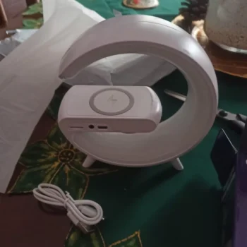 This smart lamp came with a plug and cable. It includes a wireless charger and an alarm, with multicolored lights. The brightness level is adjustable. The night-time lighting creates a great atmosphere. Overall, it's a really nice product.