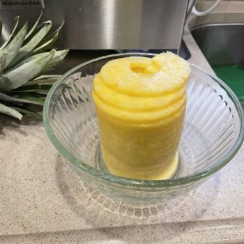 Make sure to trim the top and bottom of the pineapple evenly, so it sits flat on the counter. This really helps with removing the core effectively!!