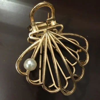 The hair claw has a lovely golden tone and is made of brass. It is crafted in the shape of a seashell and decorated with a faux pearl. Length: 2.4 in. Weight: 1.06 oz.