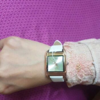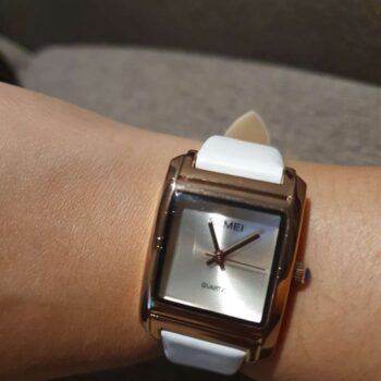 This is a very nice watch. My watches with white bands are getting a bit old so I decided to buy a new one. I saw this one and it is so cute with a big square face and golden color case and hands. It also has a nice band. Would totally recommend it!!!